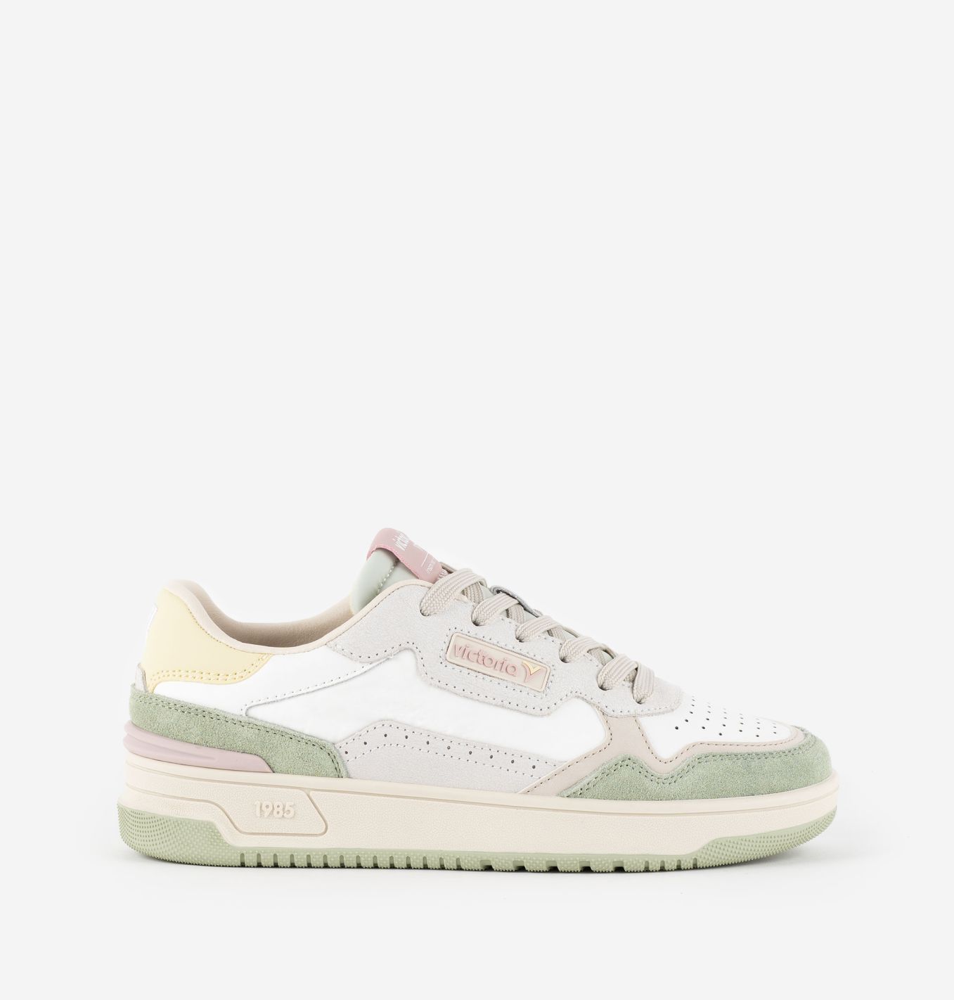Zapatillas de piel con piezas de serraje y detalles de color en PU. Logotipo retro de victoria enmarcado en el lateral. Incluyen una plantilla EVA de alta densidad para mayor confort, y su puntera está perforada para favorecer la transpiración. Suela bicolor de caucho 100% natural