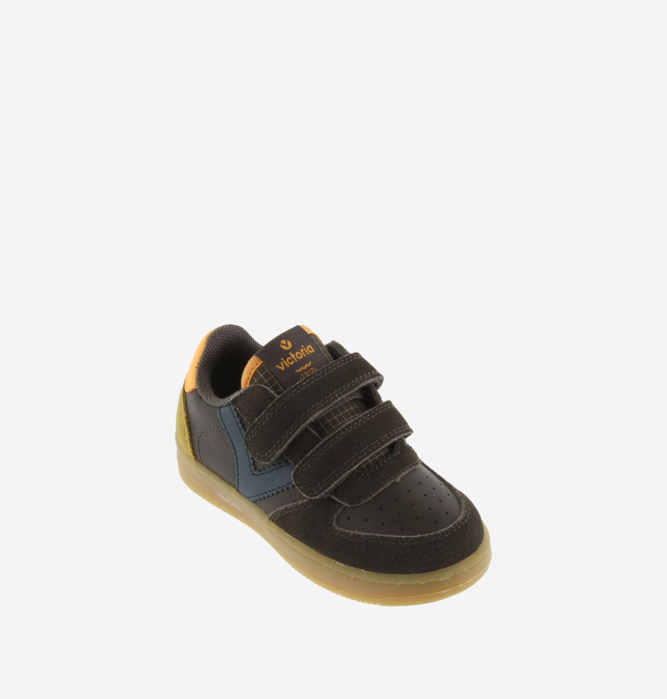 Zapatillas deportivas para niños fabricadas en efecto piel con piezas de serraje al tono. V retro de victoria lateral en contraste y detalle de color en pieza trasera. Cierre mediante dos tiras adherentes, que facilitan el calce y hacen que se ajusten perfectamente al pie. Con perforado en el empeine para favorecer la transpiración. Suela en color caramelo.